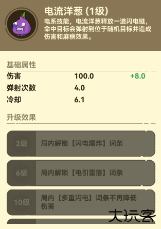 电系技能,电流洋葱释放一道闪电链命中目标会弹射到位于随机目标并造成伤害和麻痹效果。
