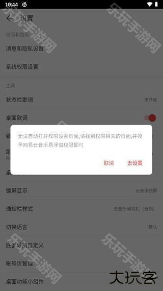 4、点击开启桌面歌词,页面出现一个设置提醒,需要开启网易云音乐悬浮窗权限,点击设置。