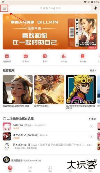 1、打开手机网易云音乐首页,点开左上角的三横杠。