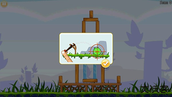 4、进入游戏后,玩法是需要将弹弓上的小鸟弹出去,砸到绿色的肥猪;