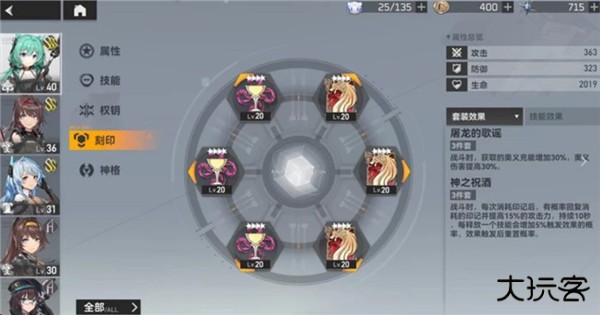 雏心:刻印选择屠龙的歌谣3件套和神之祝酒3件套,前者效果是在战斗中奥义充能获取速度增加,并且奥义伤害值增加;后者效果是战斗中在每一次消耗印记后就有概率回复印记并且提高一定的攻击力,而且在每次释放一次技能之后回复印记的概率也会增加。雏心的刻印可以增加其大招的伤害值,让雏心的能力大大增加。
