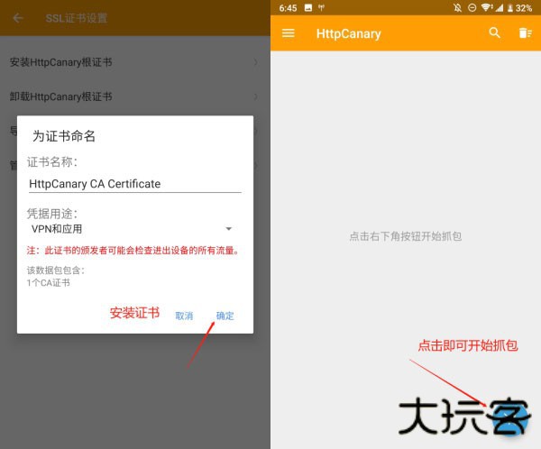 1、先下载好轻颜相机与黄鸟抓包App,首次打开软件会提示大家安装证书,这个是必须要安装的,不然无法进行抓包。