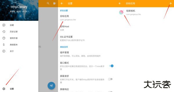 2、然后点击设置-目标应用-添加轻颜相机(为了不抓取其他多余的app的数据,方便找包)