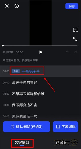 3、可智能别视频:语气词,无声片段,重复片段,选中即可一键删除,快速提高剪辑效率!