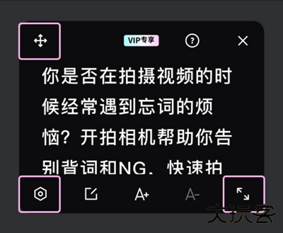 1、点击提词器顶部或左上角图标即可拖动任意位置,点击右下角图标即可调整提词器展示大小长宽度。
