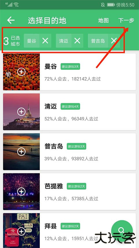 4、勾选好想去的目的地,就会显示已选城市,继续选择右上角“下一步”选项,