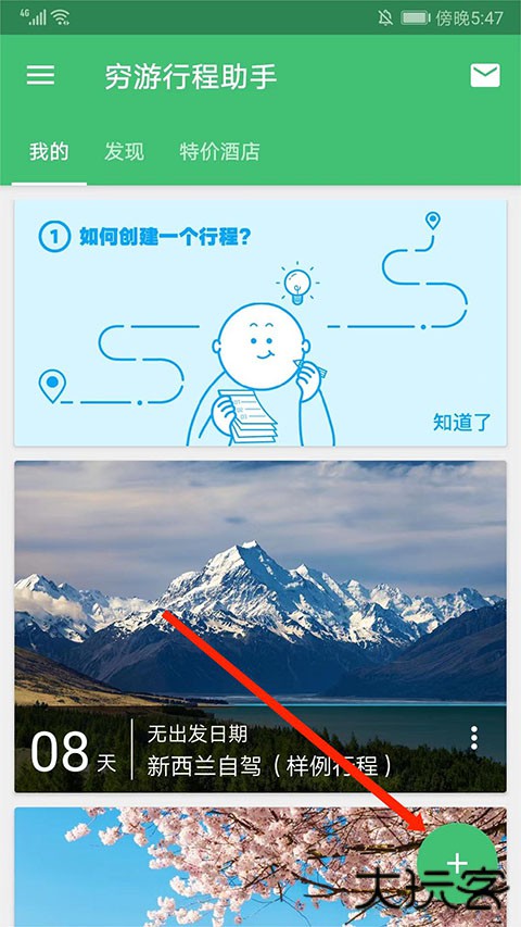 1、进入到穷游行程助手界面,然后选择右下角“加号”图标,
