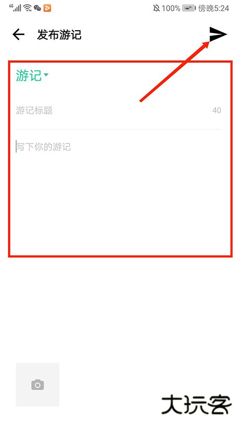 5、进入发布游记界面,编辑好“游记标题”和“游记内容”后,选择右上角“小飞机”图标即可发布游记。