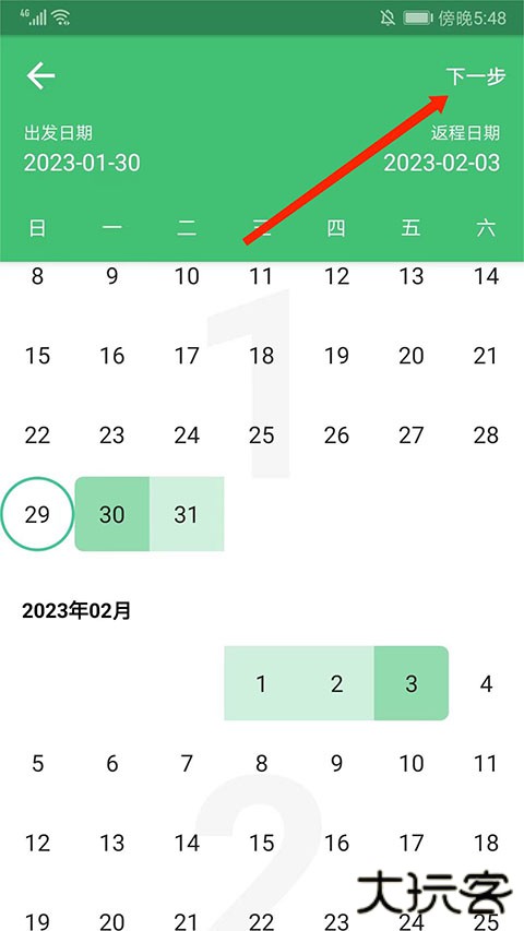 2、开始选择“出发日期”和“返程日期”,然后选择右上角“下一步”选项,