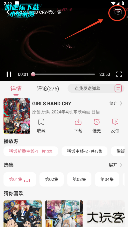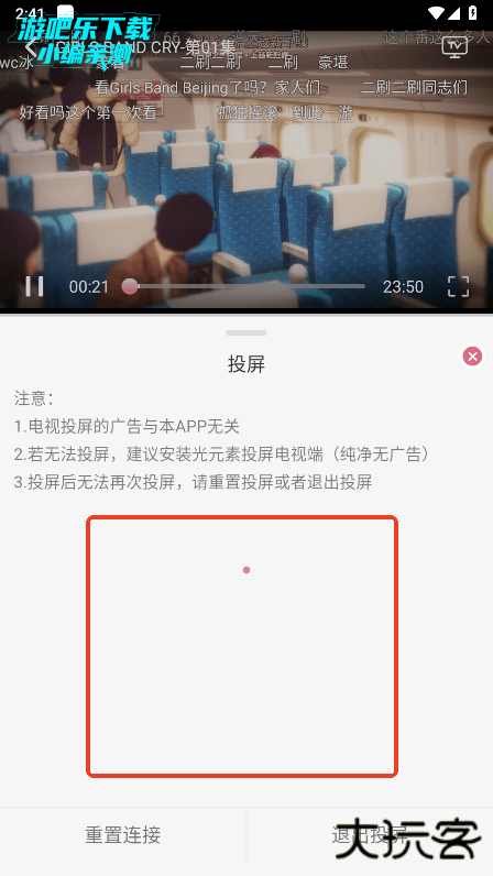 在播放页面,点击右上角的TV按钮,可以开始投屏;