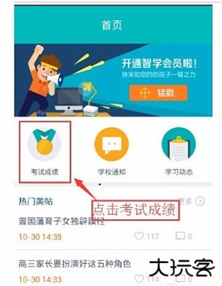 1、下载并安装智学网家长端,注册登录之后,点击考试成绩;