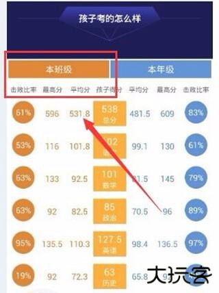 3、想要查看孩子的班级排名,在成绩单报告里面,有一个“孩子得分”以及“击败比例”,通过查看这些数据,可以大致知道孩子的班级排名情况。