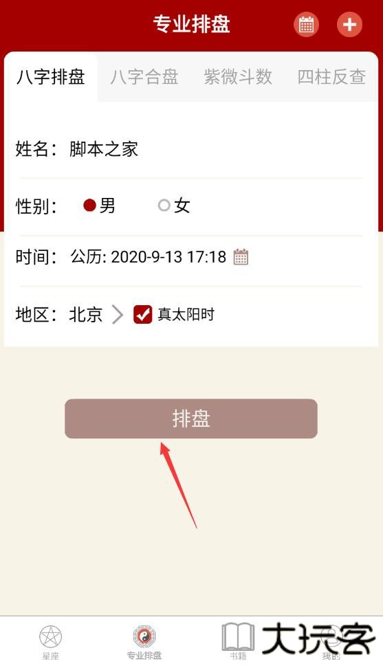 排盘界面分基本信息、基本命盘和专业细盘三个界面。