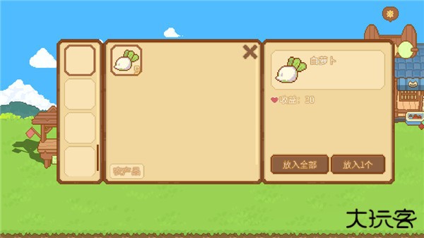 13、之后通过和新手指引交流,需要把萝卜出售出去,并获得一个摆摊车,点击选择合适的位置放置,点击放置好的摆摊车,点击全部放入,之后就会有隔壁村民前来光顾;;
