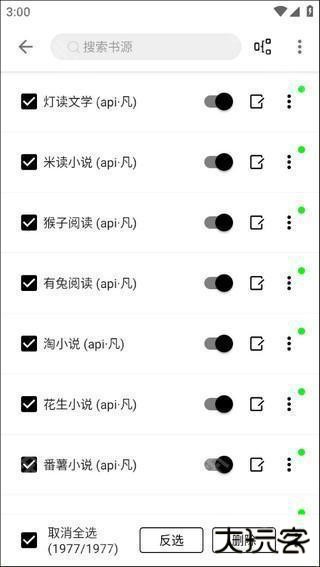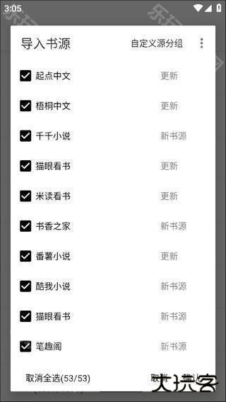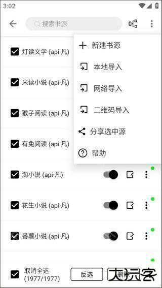 4、全选打勾之后就算启用书源了,如果还想导入大神的书源可以点击右上角的按钮