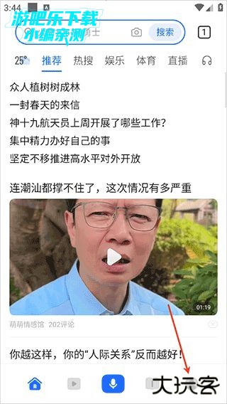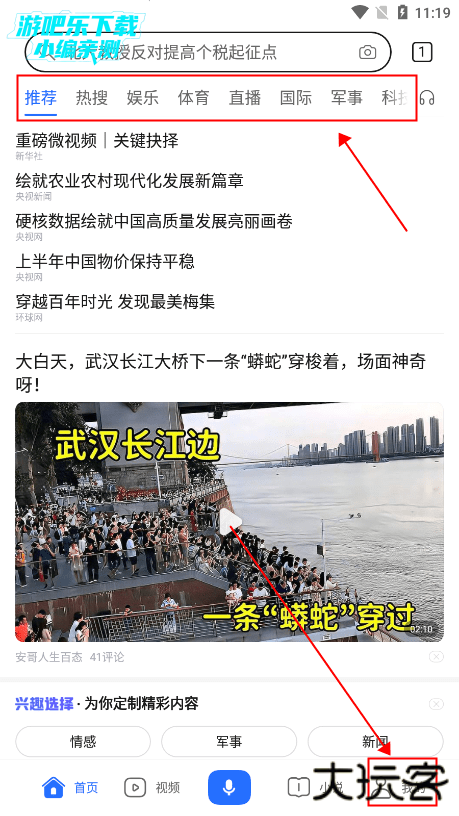2、进入app,首页可以看到推荐、热搜、娱乐、体育、直播、国际、军事和科技等板块,可以修改板块;