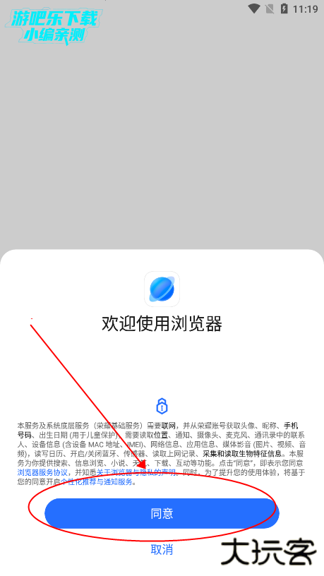 1、新用户首次进入荣耀浏览器,会提示获取权限之类,点击同意即可;
