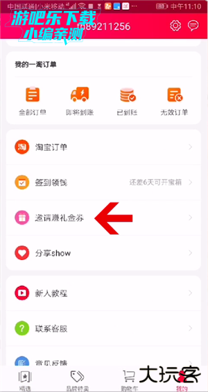 首先打开一淘app,在首页点击我的选项,这时即可看到邀请赚礼金券,