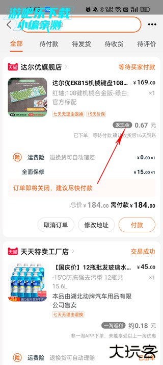 付款之后,我们就可以等待收货了,可以看到货物提示确认收货后16天到账返利金额。