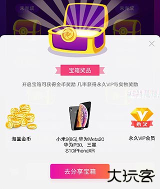 点击做任务开宝箱,还有机会获得海量金币/小米手机/华为手机/苹果手机/永久会员(流年觉得手机咱就不要想了,弄个会员或者一点点金币还是有可能的)