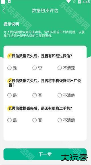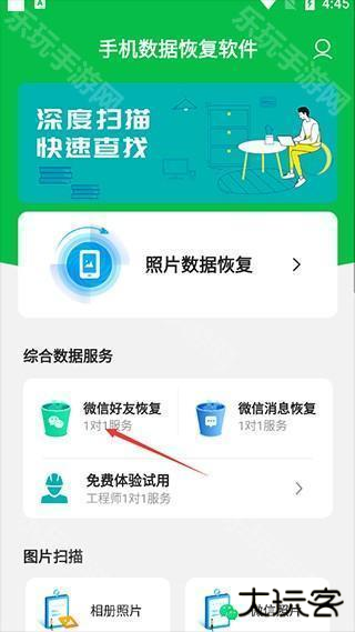 1、以大家经常需要恢复的微信好友为例子,在乐玩下载安装好手机数据恢复大师app后,点击“微信好友恢复”;