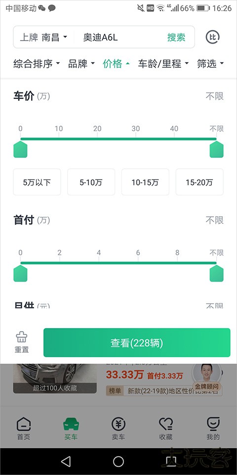 6、在搜索结果页面中可进一眇单击【价格】或【筛选】下拉按钮对车辆价格进行选择
