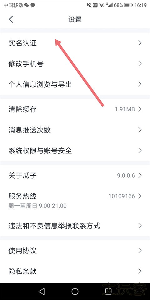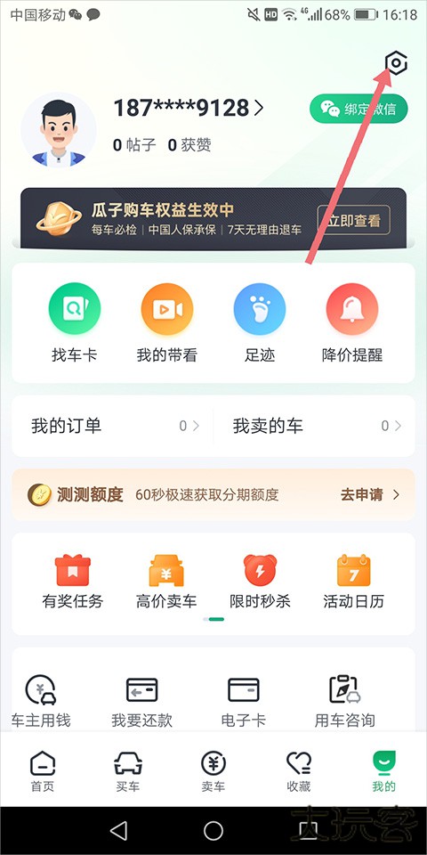 1、用户买车前需要进行实名认证,实名认证可以通过进入软件的【我的】页面中点击页面右上角的设置图标(下图红色箭头所指)