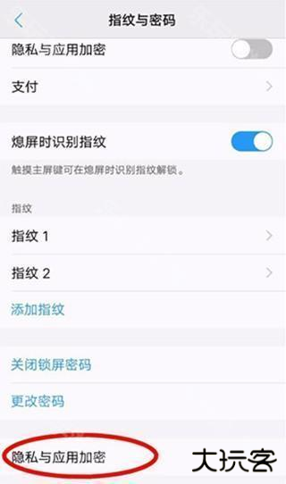 3、在指纹和密码页面点击隐私与应用加密按钮;