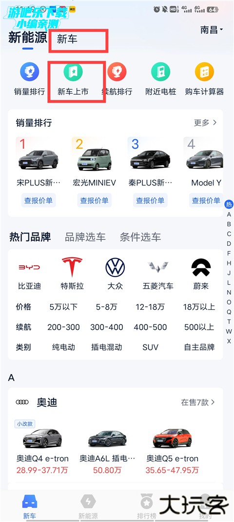 1、进入软件首页,我们可以看到有非常丰富的功能,如销量排行、新车上市、续航排行、查成交价等等,如果用户想要查询最新汽车报价的话,可以点击新车上市;