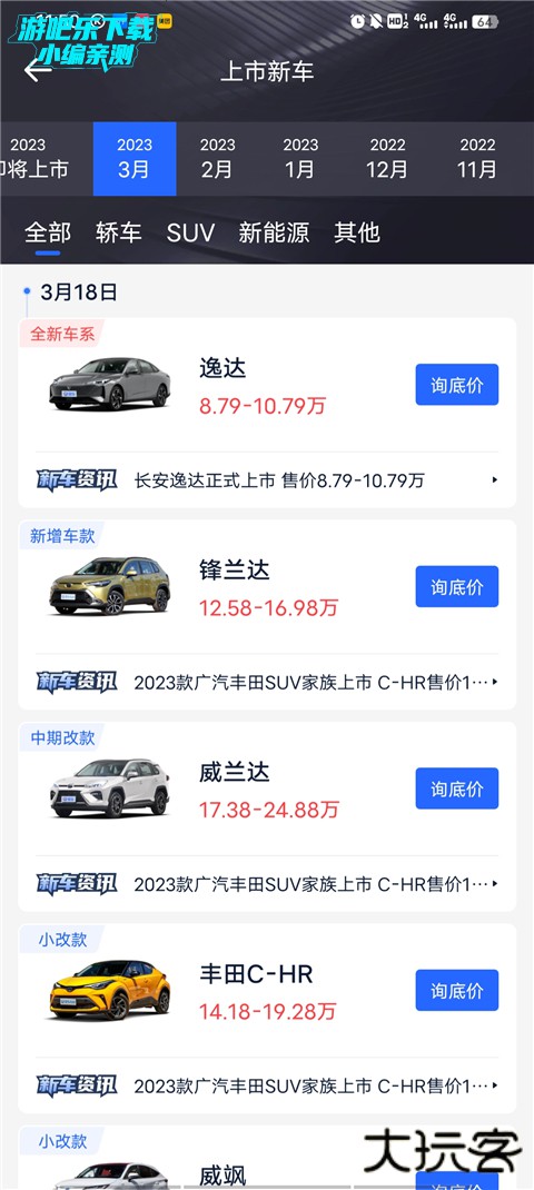2、里面为用户提供了即将上市,以及每月份的上市新车日历,并且还有轿车、suv、新能源和其他汽车的分类,用户可以选择自己喜欢的类型新车进行查询报价;