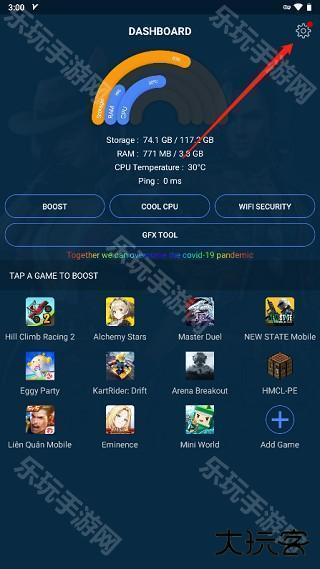 1、进入gfx游戏助推器后,点击右上角齿轮按钮;