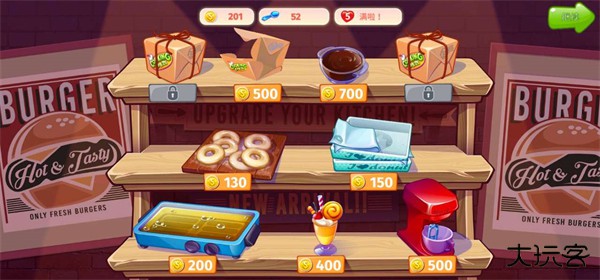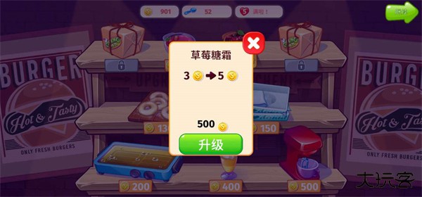 5、随着后面关卡难度的提升,我们也要开始升级厨具和食品;