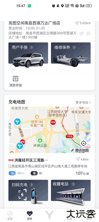 3、点开服务,这里可以看到车辆的维修保养最近的门店推荐以及车辆充电桩的地图;
