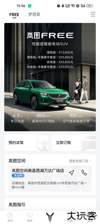 1.岚图汽车APP包含维护、社区互动、购车看车、蓝途汽车软件一键购车预约等服务模块。