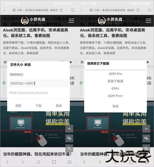 下载也是非常重要的功能,虽然「米侠浏览器」默认的下载功能比较简单,不过支持调用其它下载器,例如 ADM、IDM、系统自带。