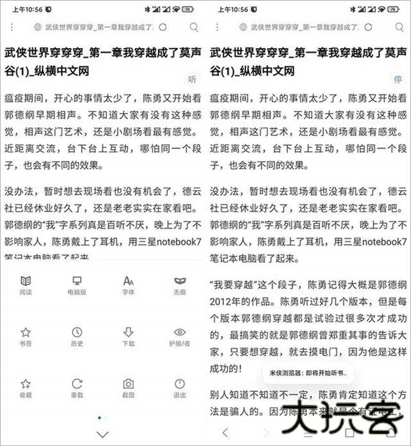 不过「米侠浏览器」的阅读模式为小说党定制,当你切换到阅读模式时,会出现一个 "听"