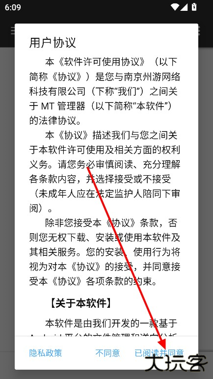 1、下载安装mt管理器官方版,点击“已阅读并同意”