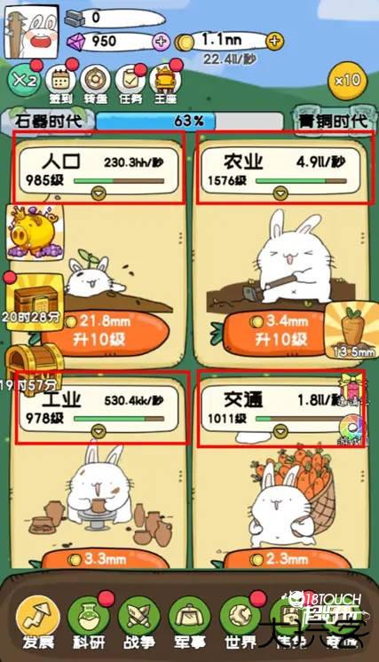 萌兔世界里我们首先需要认识的就是游戏中最常用的货币—金币。在游戏中,金币是升级游戏内各项科技研究所需要用到的资源,玩家前期金币数量较为稀缺,这时候就需要玩家们尽快升级几类科技内容,包括人口、农业、工业、交通,在这里小编推荐小伙伴们优先解锁所有的科技板块哦,将所有板块解锁后即可以针对不同板块情况进行升级