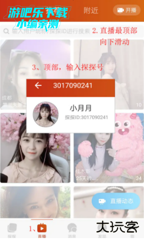 2、进入直播界面,*顶部向下滑动屏幕,会显示隐藏的搜索栏,点击搜索框,输入对方的探探id;
