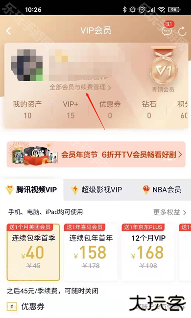 第1步:打开腾讯视频“个人中心”页面,点击视频VIP,选择【全部会员与续费管理】。