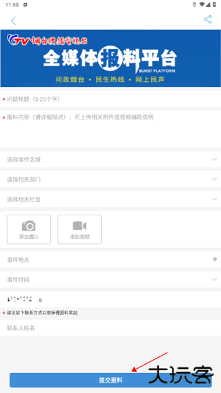 3、接着填写报料内容以及相关的时间、地点等信息,最后点击提交报料即可。