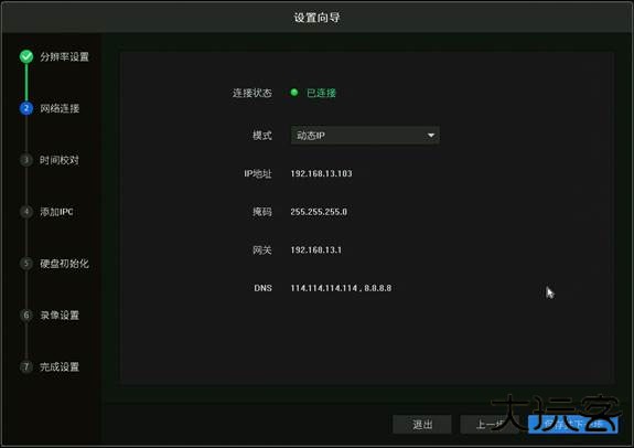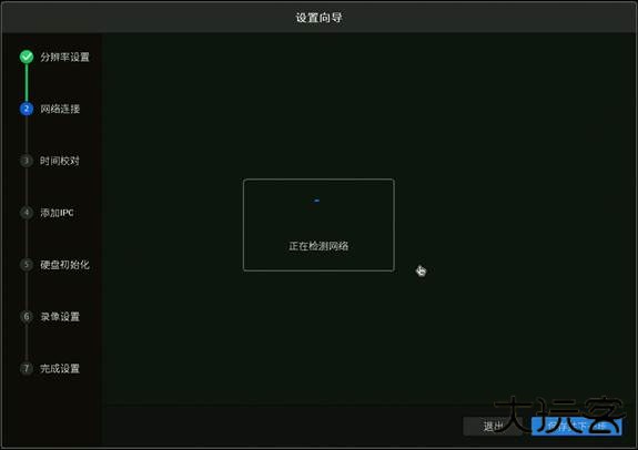 1、将录像机连接到可以上网的路由器或交换机上。录像机开机后走设置向导,设置好分辨率后,会自动检测上网方式: