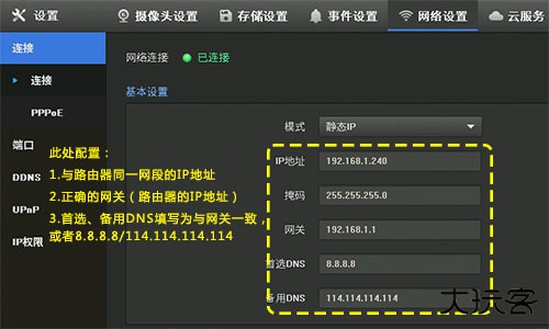 答:请按照第1步指导,检查NVR的网络参数,务必配置正确的IP地址、网关以及DNS地址,确保可以正常上网。如果不确定网段,将NVR设置为动态IP。