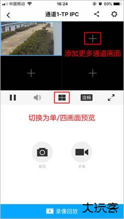 6、点击窗口下方/ 即可切换单/四画面窗口预览,点击【+】可以添加更多通道画面: