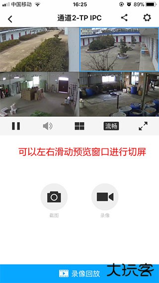 单画面或四画面预览时,都可以通过左右滑动预览窗口进行切屏: