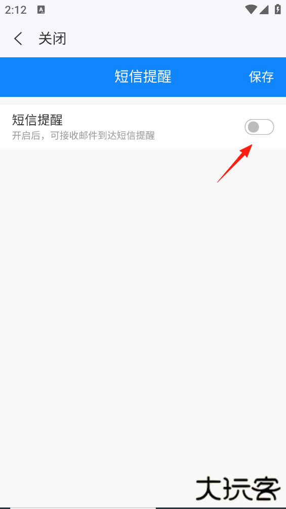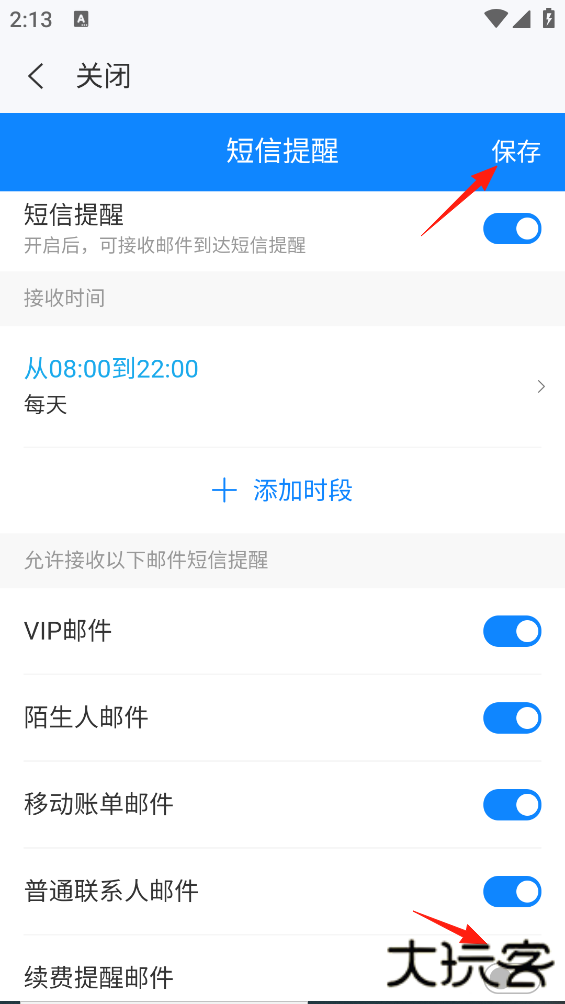 6、记得将屏幕下方的“续费提醒邮件”开启,这个选项默认关闭,最后点击右上角的“保存”。这样就完成了“邮件达到短信通知”。