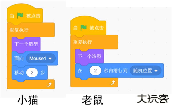 切记,小猫编程代码中的移动步数必须比老鼠的移动步数少,不然老鼠很容易被小猫追上。