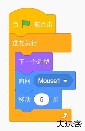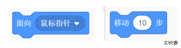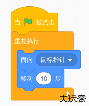 鼠标指针在场景中进行移动,老鼠面向鼠标指针移动,然后小猫面向老鼠进行移动。这样,只要鼠标指针在不停地移动,老鼠和小猫都相应地移动。