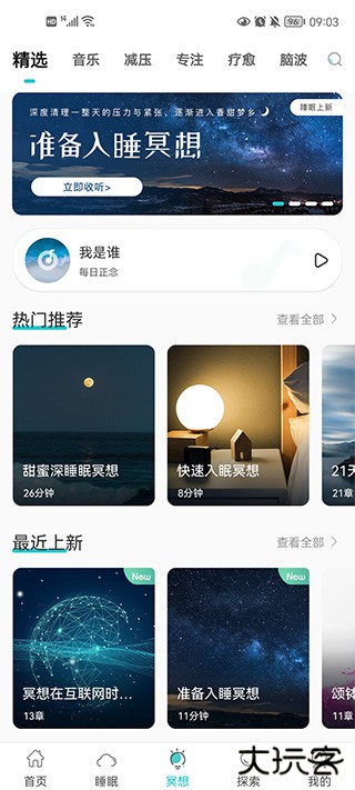 2、页面的顶部包括:助眠冥想、睡眠故事、音乐、白噪音、助眠脑波这些分类。