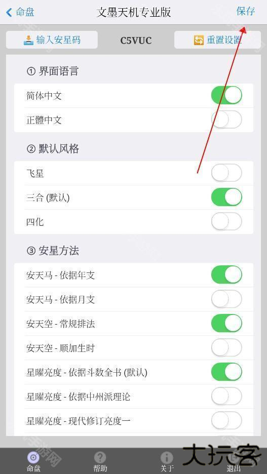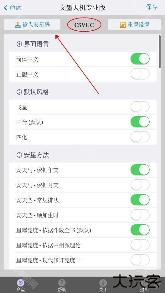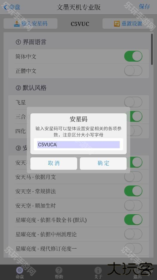 2、点击“输入安星码”,中间红圈中的就是安星码,可以输入其他已经设置好的安星码,这样就能出现与之一样的排盘了